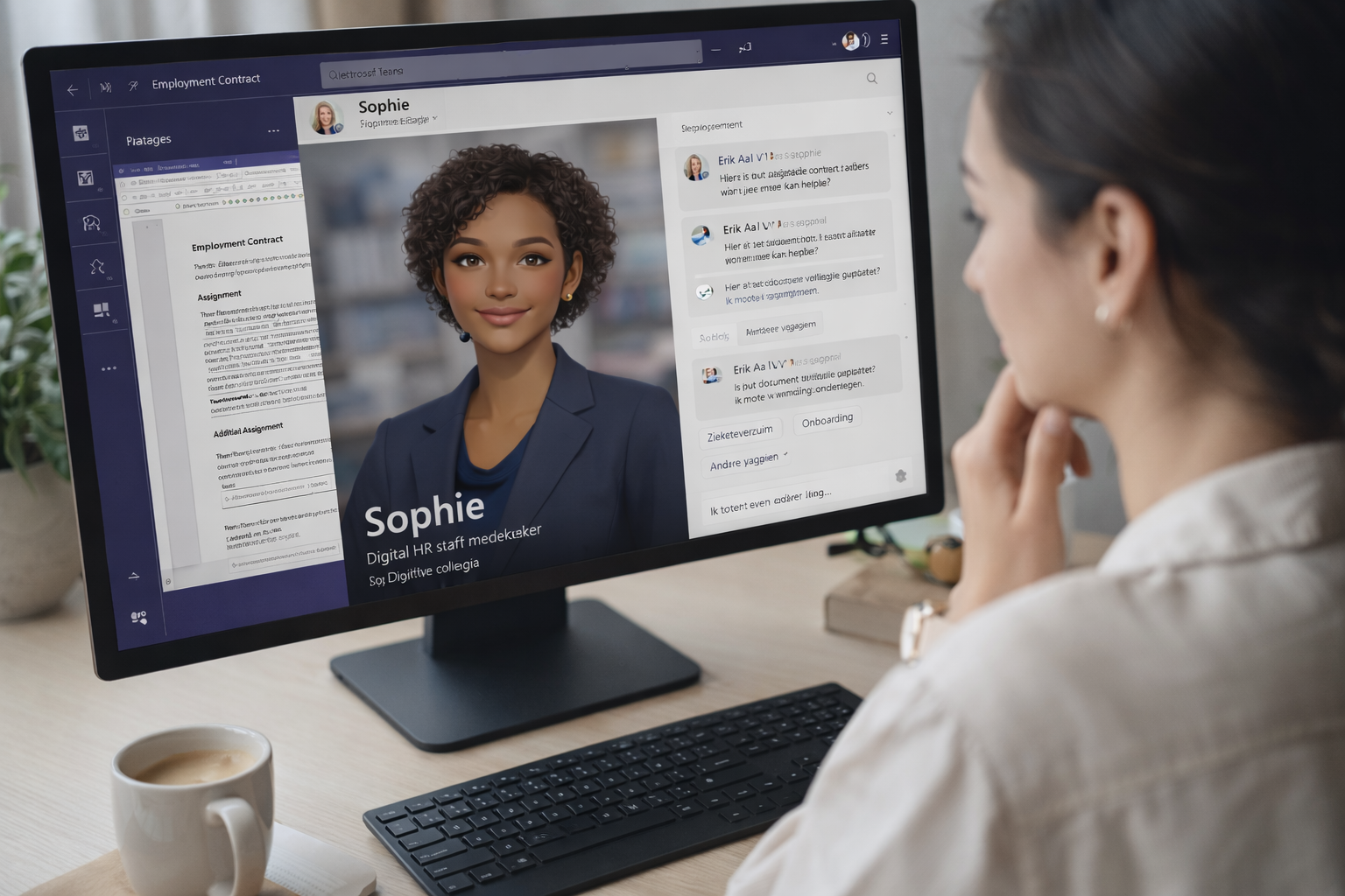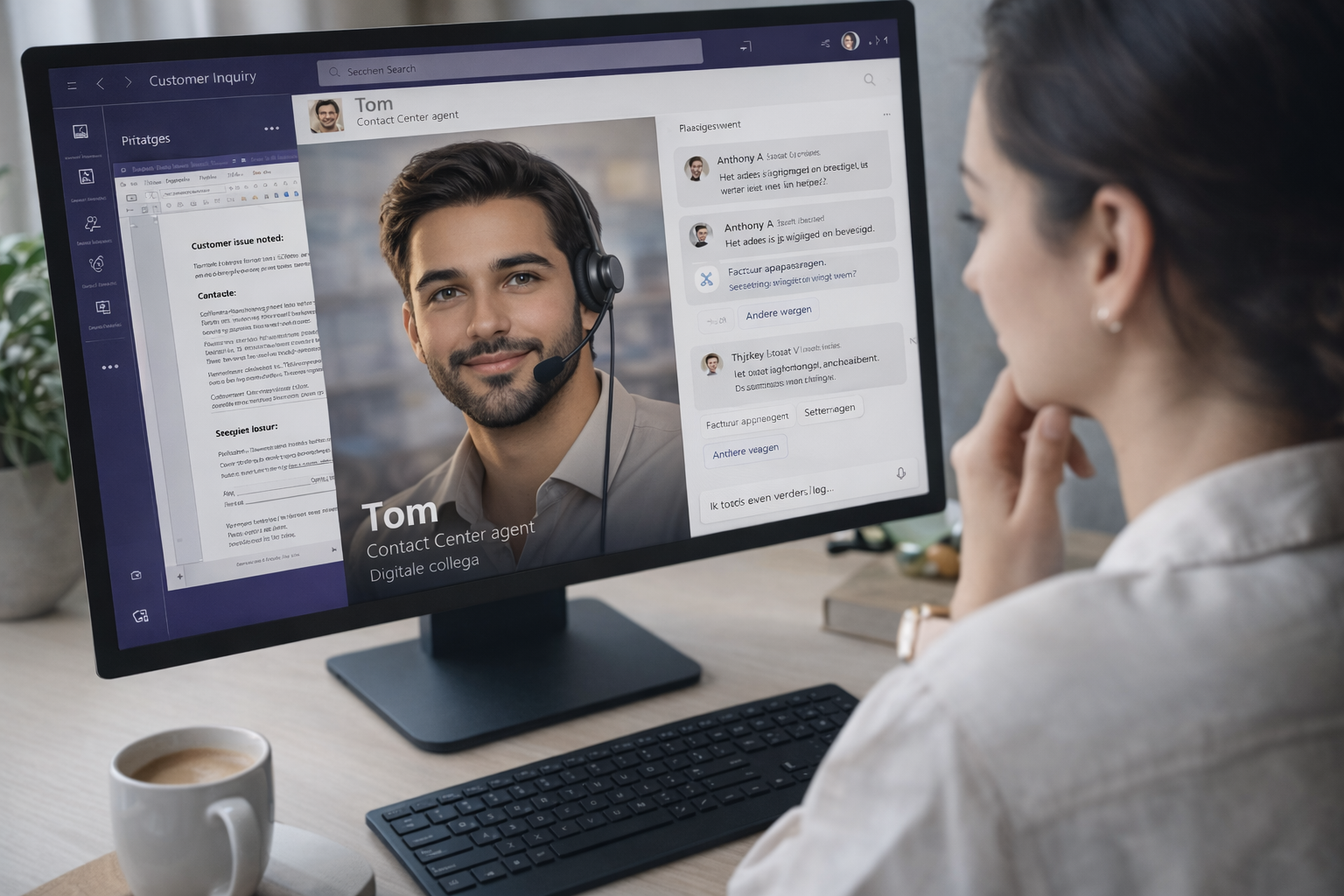 A conference room setting with several laptops on a large table, each being used by a person. A large screen displays a blue interface with the text 'Generate ad creatives from any website with AI'. A stainless steel water bottle and a conference phone are also visible on the table.